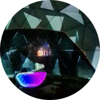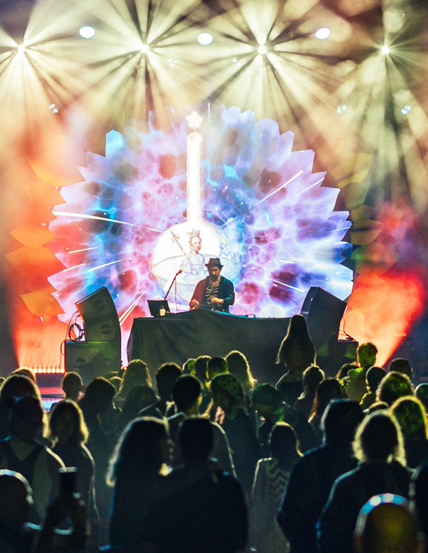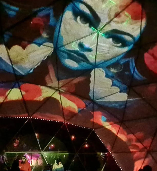 Pavilion se convierte en una nave inmersiva gracias al arte de Ale, capaz de transmitir el camino sensorial interno en una puesta visual que nos acompaña y sostiene en diferentes instacias del viaje.